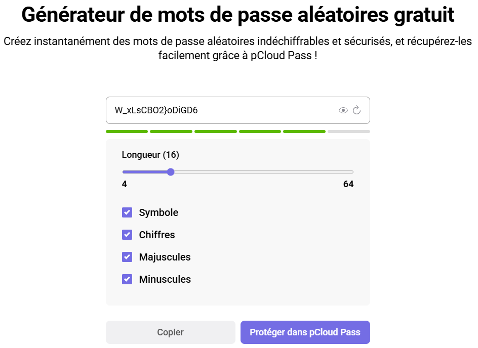 Le générateur de mots de passe pCloud Pass crée instantanément des mots de passe complexes conformes aux bonnes pratiques recommandées en cybersécurité.