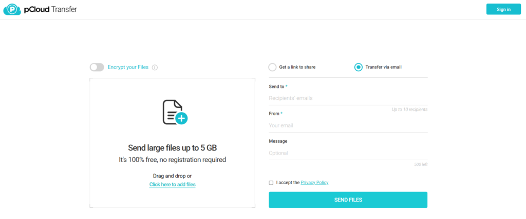 pCloud Transfer permet de transférer gratuitement de gros fichiers (jusqu’à 5Go) à des clients ou partenaires sans création de compte.