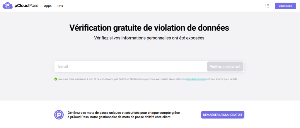 Le Data Breach Checker de pCloud permet de savoir si une adresse e-mail professionnelle figure dans une base de données compromise, étape clé pour prévenir le phishing et l’usurpation d’identité.