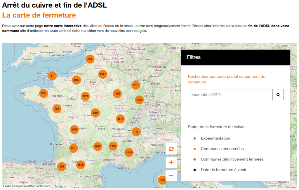 Une carte en ligne permet de consulter les dates de fermeture progressive de l’ADSL par commune. Il suffit de rechercher votre ville pour connaître le calendrier de fermeture dans votre zone : https://reseaux.orange.fr/nos-reseaux/modernisation-des-reseaux/evolution-de-la-telephonie-fixe-et-internet